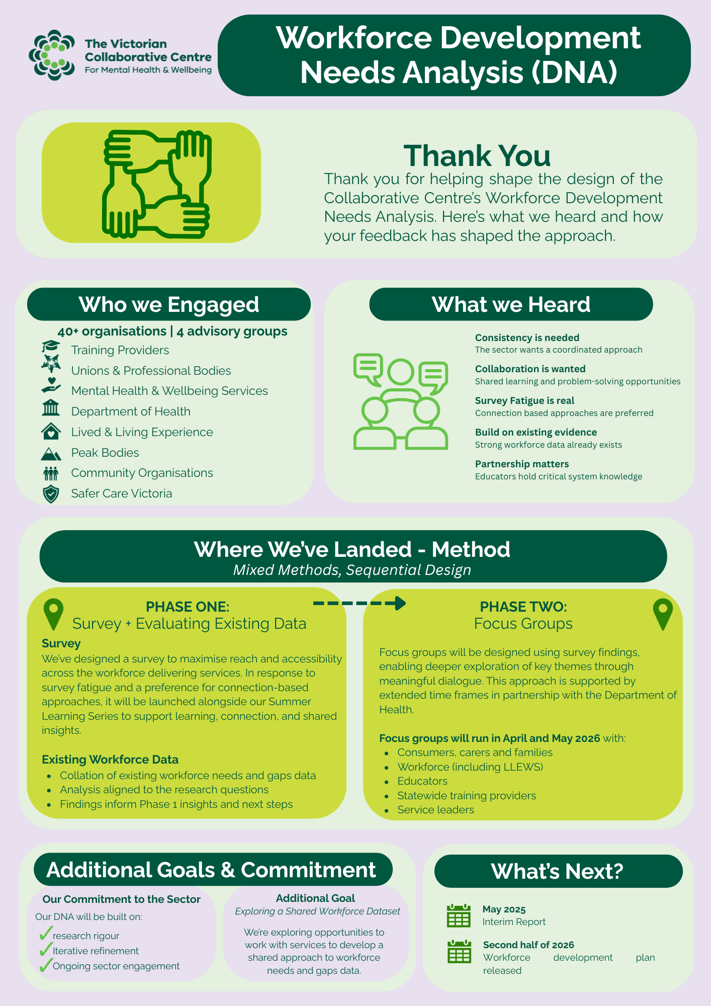 During the first stage of data collection, we’d locating relevant existing research and data on mental health workforce needs and gaps in Victoria, and conducting a survey. We are pairing the launch the survey and data collection phase with a Summer Learning Series. Sign up and find out more here.