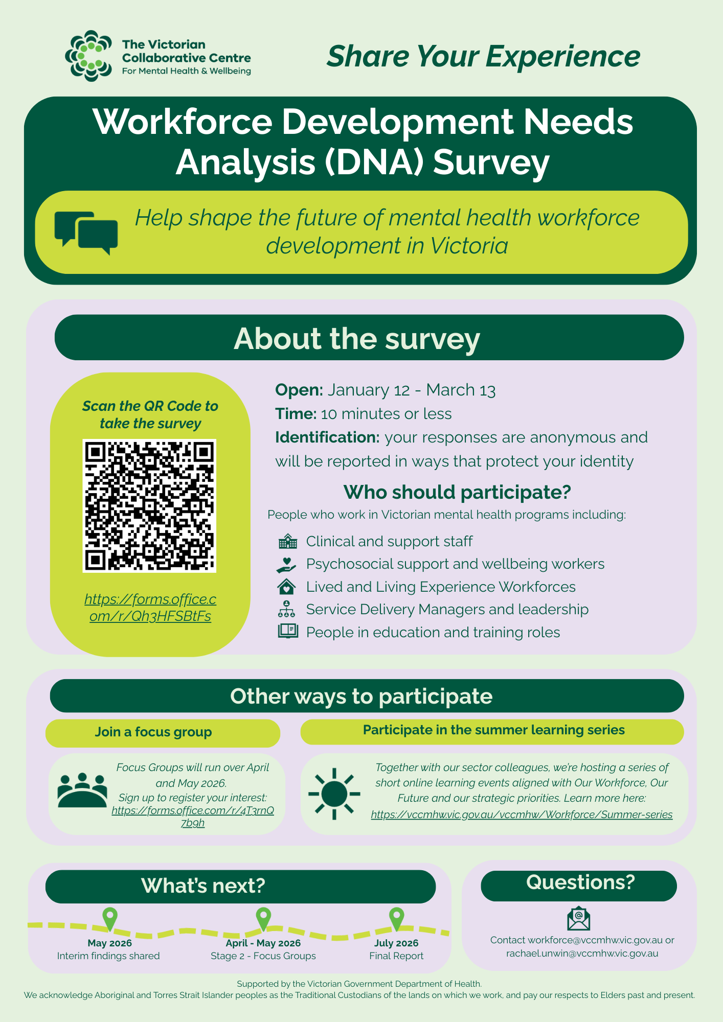 This stage includes a statewide workforce survey alongside a review of existing research and data on mental health and wellbeing workforce needs in Victoria. Together, this will help build a shared picture of what is working, what is missing, and what needs to change.